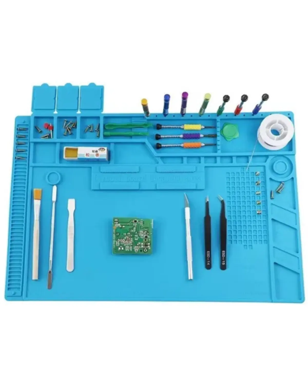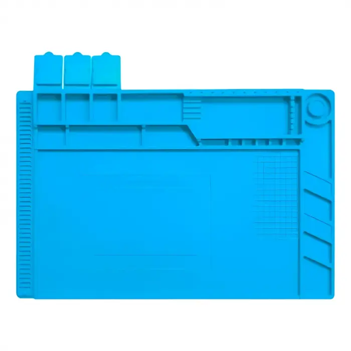 Herramienta indispensable para trabajos de reparación y mantenimiento de dispositivos electrónicos. Fabricada en silicona térmica y antiestática, protege los componentes y facilita una organización eficiente durante el trabajo.
